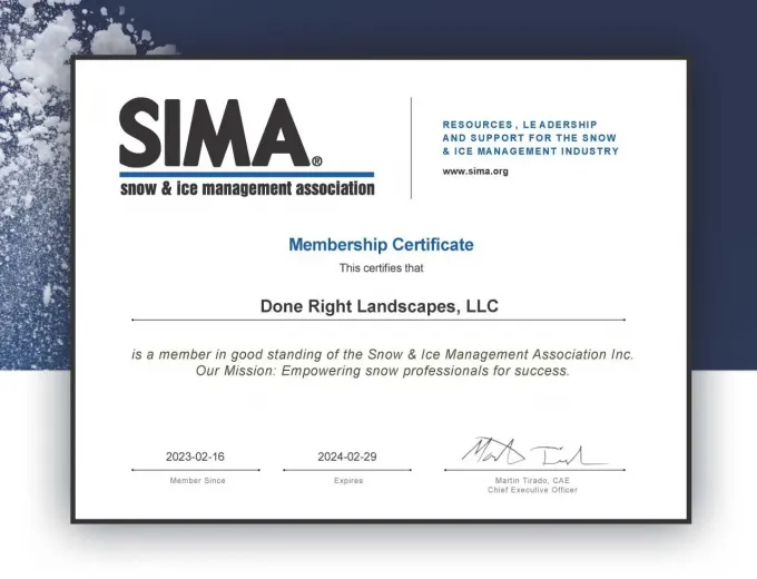 Done Right Landscapes is proud to have this certificate from Sima, which means we are a member in good standing of the Snow and Ice Management Association. That means you can trust us to get the job done for your commercial snow removal and ice job.